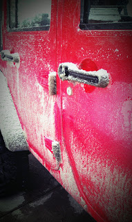 This is what the jeep looked like after the three hour drive in snow from Mammoth Lakes to South Lake Tahoe.