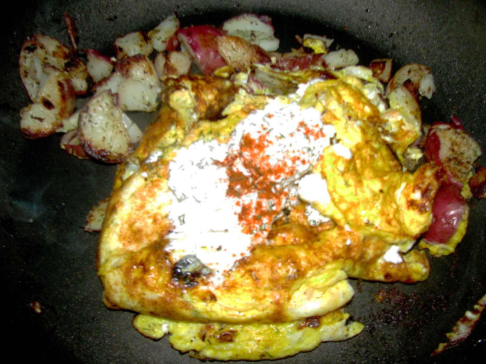 Poke holes in the potatoes and microwave them 3 minutes until soft. Heat oil in the pan, add the potatoes with salt dill, and pepper, brown until crispy. While the potatoes are browning, mix eggs, crab, lemon, dill, pepper and cayenne. When the potatoes are mostly cooked, move them to the side of the pan, add more coconut oil, add the egg mixture. When it is set, turn it over, dollop goat cheese, add a sprinkle of cayenne, dill and a squeeze of lemon. Turn the omelet in half covering the goat cheese and serve with the potatoes, and plenty of franks red hot sauce.
