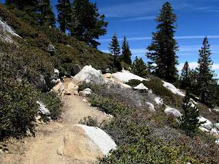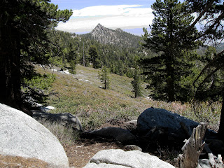 The beginning of the trail is all in the shade and it is truly gorgeous and pretty cool, weather wise. This area of the San Bernardino Forest must not have burned in decades. The pines are so very thick. Tauqawich Peak looms large granite and intense so high above to the east. It is intimidating, but I know we will hike much farther up than even that by nine a.m.